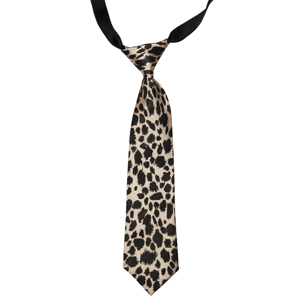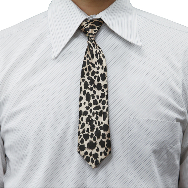 ちょい悪系を目指す貴方に、小物でレオパード柄のネクタイはいかがですか?全長はおよそ25.4cm、大剣幅は6.6cmで、派手なデザインではありますが、光沢感のある生地と黒1色の斑点が、どこか落ち着いた印象を与えるサイズ調整可能なネクタイ。