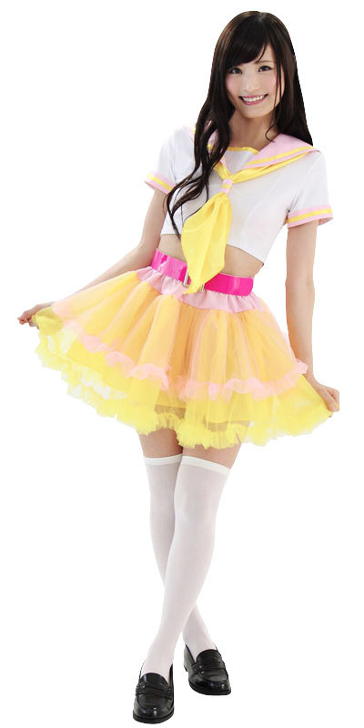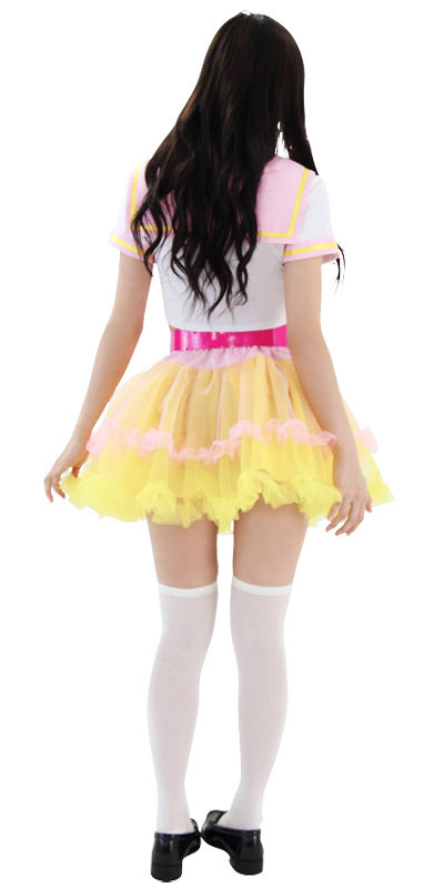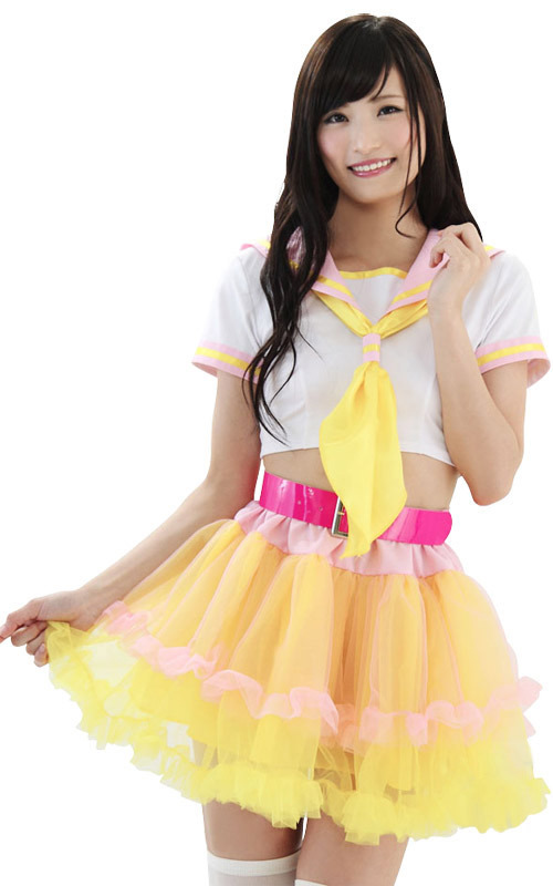 ●ピンク&イエローのパステルカラー●差し色の鮮やかピンクな太ベルト●トップスはおヘソが見える短め丈●ふんわり広がるパニエスカート●統一感のあるアイドル風セット。