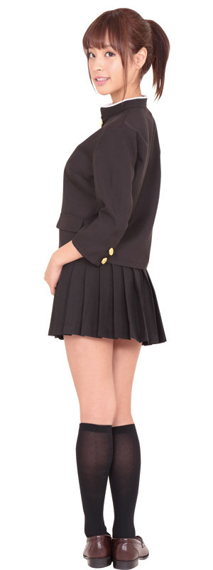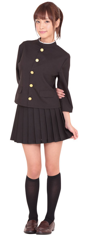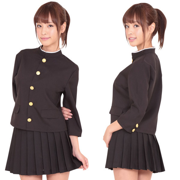 ●七分袖・女性サイズに仕立てた丈の短い黒色学ラン●詰襟制服にキラキラと映える金ボタン●ミニスカートはシンプルなプリーツ仕立て。