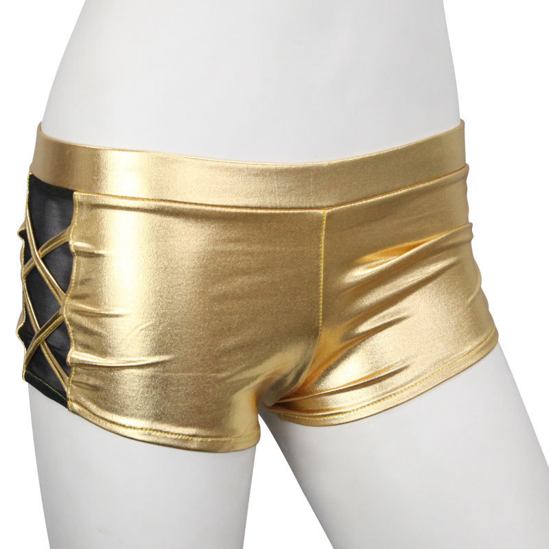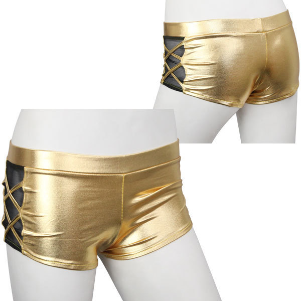 ●メタリックなゴールドカラー●光をキラッと反射するきらめき●ローライズ気味なホットパンツ●両サイドにダブルクロスデザイン●シースルー生地を添えて妖艶に。