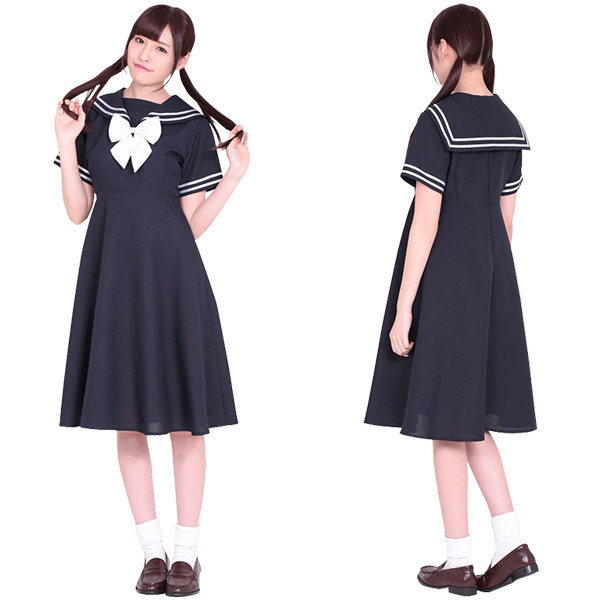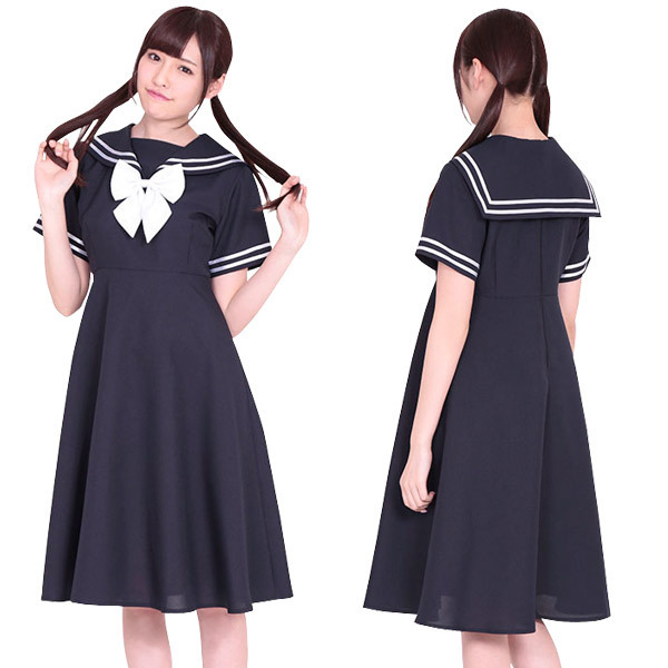セーラー服では珍しいワンピースタイプ!ハイウエストデザインなのですっきりとした清楚な印象に♪可愛らしい白リボンをアクセントにしたスクール制服コスチュームです。