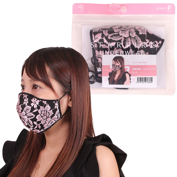 黒地にピンクの薔薇刺繍が可愛い柔らかな大人用レースメッシュマスク。