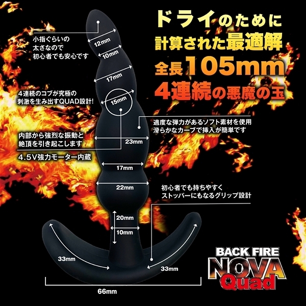 人気のバックファイアシリーズから「バックファイアーNOVA QUAD」が登場!クワッドは座薬ぐらいの大きさの1センチ大の先端から始まり、指のような緩やかなカーブで1.6センチ、2.2センチ、2.1センチの大きさのコブが続く仕様となっています♪全部で4連続の(クワッド)の隆起が続く設計で、内部に密着し緩やかなカーブが、前立線やGスポットなどをダイレクトに刺激してくれるのが特徴です!奥まで入れると入り口付近で強烈な振動と快感を引き起こすスタイルで未知の衝撃と快感を味わわせてくれます♪カラーバリエーションはブラックとピンクでこちらはブラックとなります。