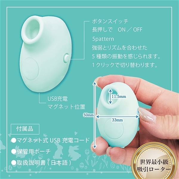 アンケートで女性に好評だったパステルカラー3色が揃ってデビュー!「エアーバルブ方式」を採用し、近年発売されるトイの中でも注目度の高い吸引系グッズを、世界最小レベルの超小型化に成功。