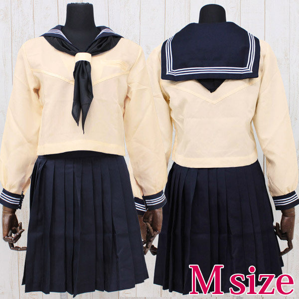 ●切り替えデザインが珍しい・クリーム色に紺が映える長袖セーラートップス●袖口と襟には白い3本ライン入り●セクシー感控え目・細かいプリーツの膝丈濃紺スカート●後襟からのぞく三角形が可愛い黒スカーフ。