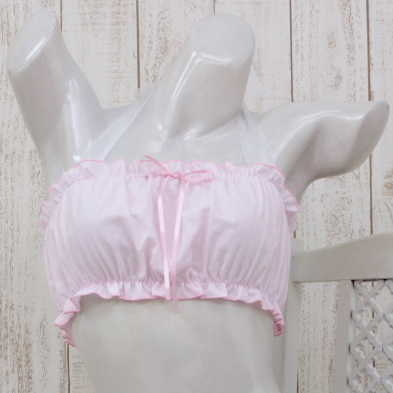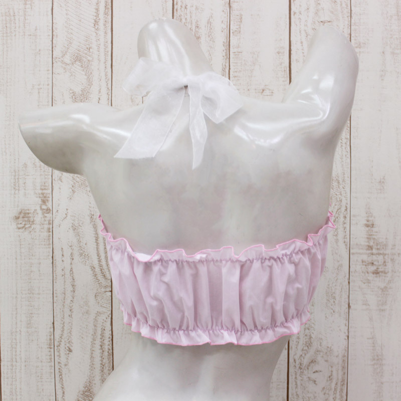 ●ふんわりパステルピンク×ホワイト●バストをすっぽり覆うチューブ型●上下にたっぷりフリルギャザー入り●フロント真ん中に繊細リボンをON●ホルターネックはオーガンジーリボンで可愛らしく。