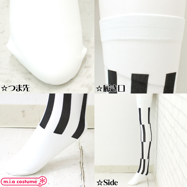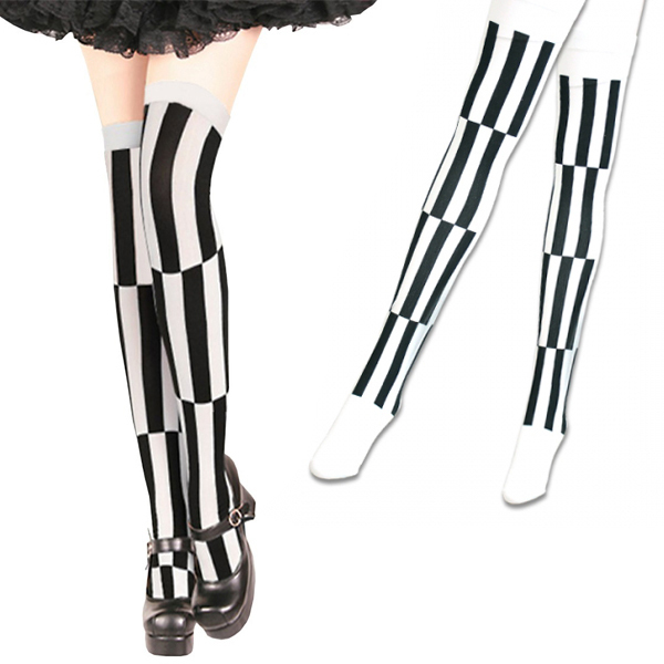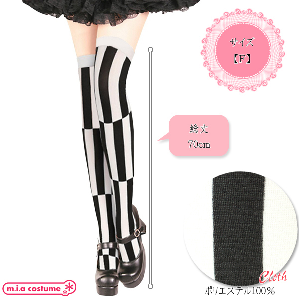 ゴシック&ロリータファッションと相性抜群!ブロック模様の白黒ストライプ柄ニーハイストッキング70cm。