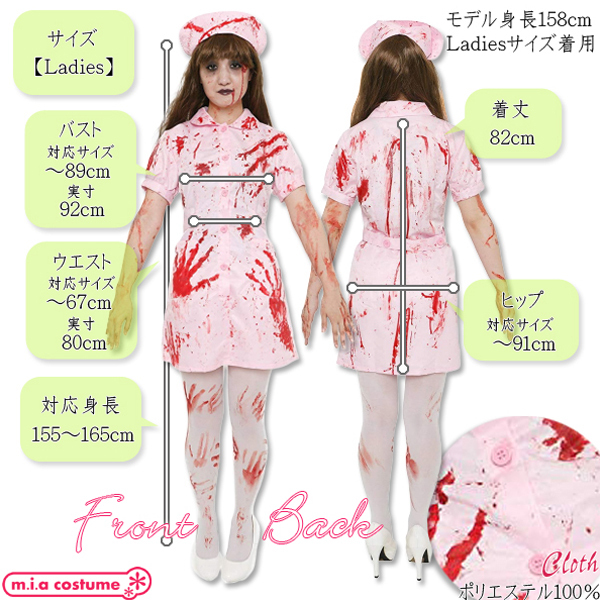 ■仕様:Ladiesサイズ:B〜89cm・W〜67cm・H〜91cm・身長155〜165cm・着丈82cm セット内容:ナースキャップ、ワンピース(前ボタン)、血糊 素材:ポリエステル100%