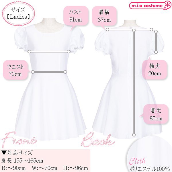 ■仕様:対応サイズ:身長155〜165cm・B〜90cm・W〜70cm・H〜96cm 実寸:B91cm・W72cm・肩幅37cm・袖丈20cm・着丈85cm セット内容:ワンピース単品(背中心ファスナー) 素材:ポリエステル100% モデル身長155cm