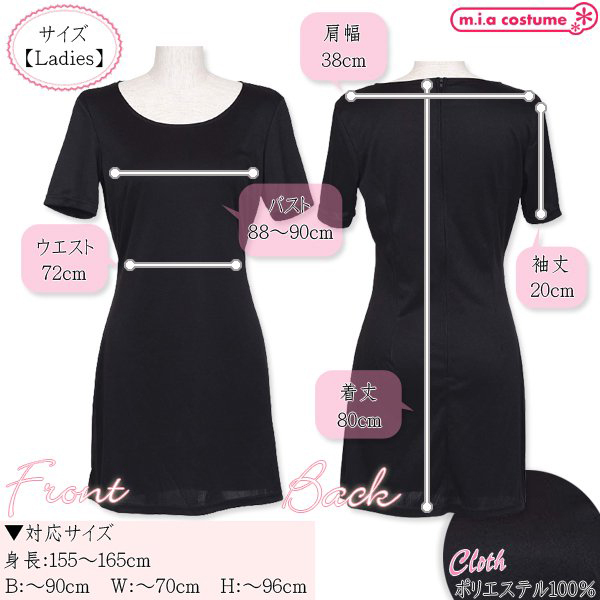 ■仕様:対応サイズ:身長155〜165cm・B〜90cm・W〜70cm・H〜96cm 実寸:B88〜90cm・W72cm・肩幅38cm・袖丈20cm・着丈80cm セット内容:ワンピース単品(背中心ファスナー) 素材:ポリエステル100% モデル身長155cm