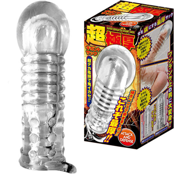 超巨大な亀頭に彼女もびっくり!逞しくさらに強くペニスを強化する「超極厚ギガントサック」です。