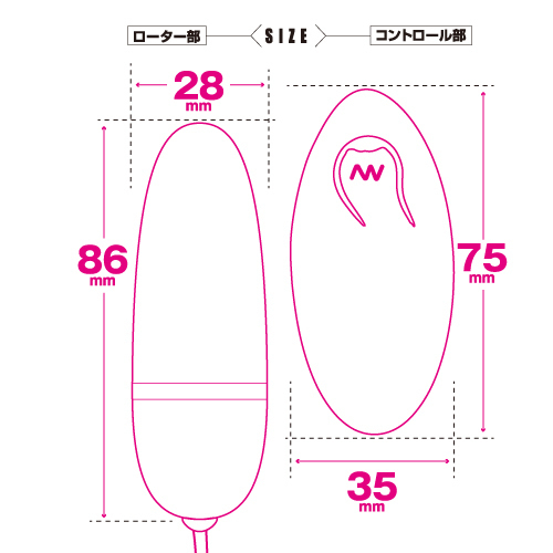 ■仕様:パッケージ:16.5×9.0×5.0cm 本体:ローター8.6×2.8cm・コントローラー全長7.5cm 重量:182g 電池:本体(単四電池×1本使用)、コントローラー(単四電池×1本使用)