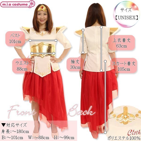 ■仕様:男女兼用サイズ:身長〜180cm・B〜101cm・W〜88cm・H〜99cm・着丈(上衣63cm・スカート105cm)・袖丈30cm) セット内容:上衣(背中心ファスナー)、スカート(ウエストゴム)、ヘアバンド 素材:ポリエステル100%