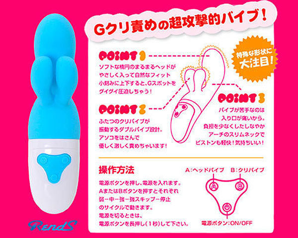 ●愛らしいフォルムで大人気だった前作のミニタイプ●しなやかに曲がるソフトボディ●最大径36mm程の楕円ヘッドがGスポットを的確に刺激●ダブル突起がクリトリスを挟み撃ち●ヘッドと突起部分は個別操作可能●AorBボタンで振動を操作●電源ON/OFFは1秒長押し。