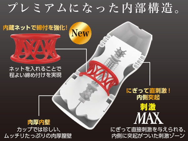前モデルに比べフィルムの耐久性アップ!破れにくく安心して強く握りしめられるようになりました♪また、内部にはネットリングを内蔵し締め付けを強化!そのまま使っても良いですが、外側から握って圧力をかけることで内側に設置された突起の刺激をよりお楽しみいただけます。