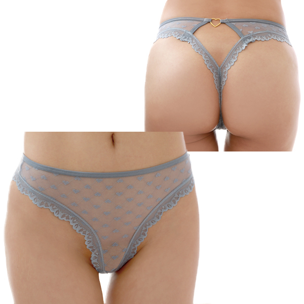 ラブリーなハート模様を控えめに魅せるデザインがポイント!グレー系のカラーメッシュ素材の透け見える感じで大人っぽさもあるTバックショーツ。