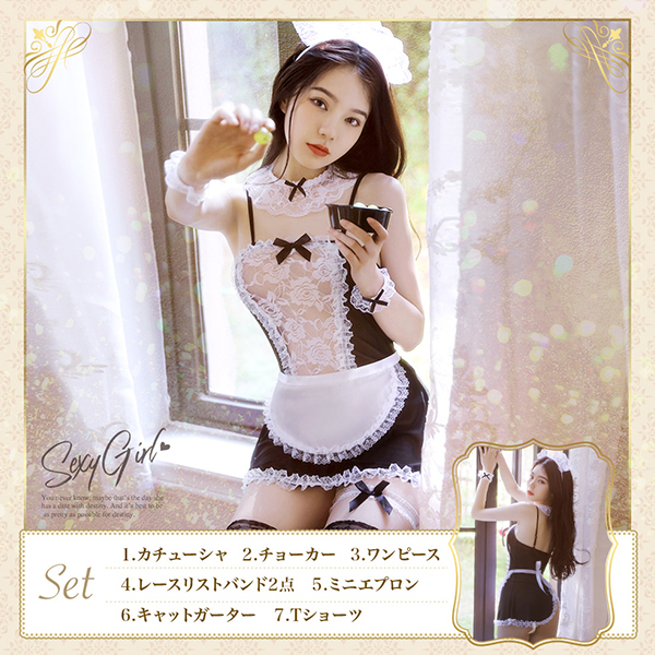 ■仕様:フリーサイズ セット内容:カチューシャ、チョーカー、ワンピース、レースリストバンド×2、ミニエプロン、キャットガーター、Tバックショーツ